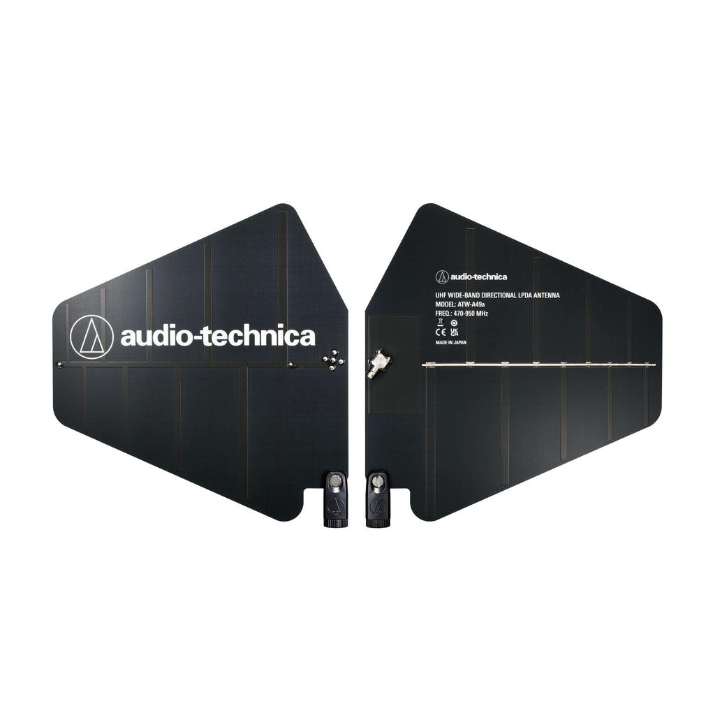The Audio-Technica ATW-A49A is a pair of UHF wide-band directional LPDA (log periodic dipole array) antennas that provide enhanced signal pickup for UHF wireless systems throughout a wide band range (470-950 MHz). Each antenna paddle is matched to 50 ohms impedance with an integral high-quality low-loss BNC connector; 6 dB gain. For permanent or temporary installation, mounts to 5/8"-27 threads.