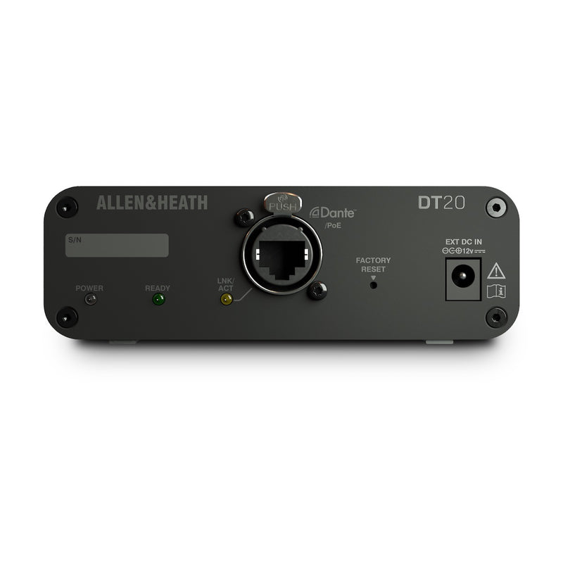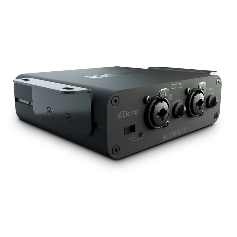 The Allen & Heath DT20 is a compact 48kHz/96kHz Dante interface enabling convenient placement of 2 mic/line inputs wherever you need to get analog audio into a Dante network.