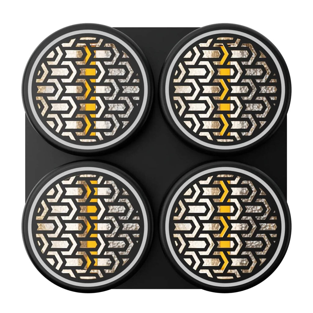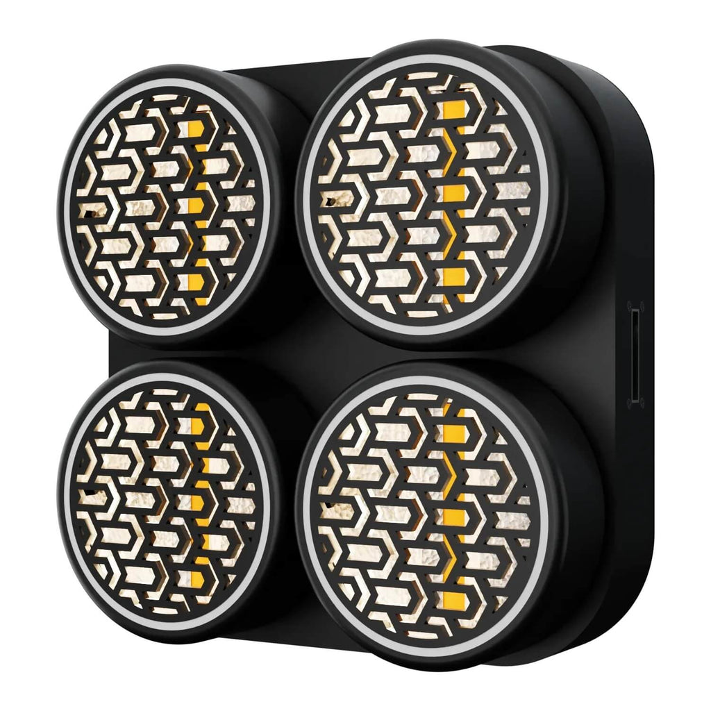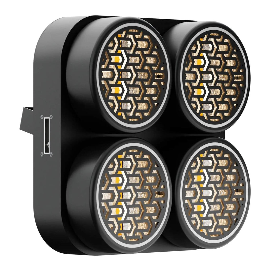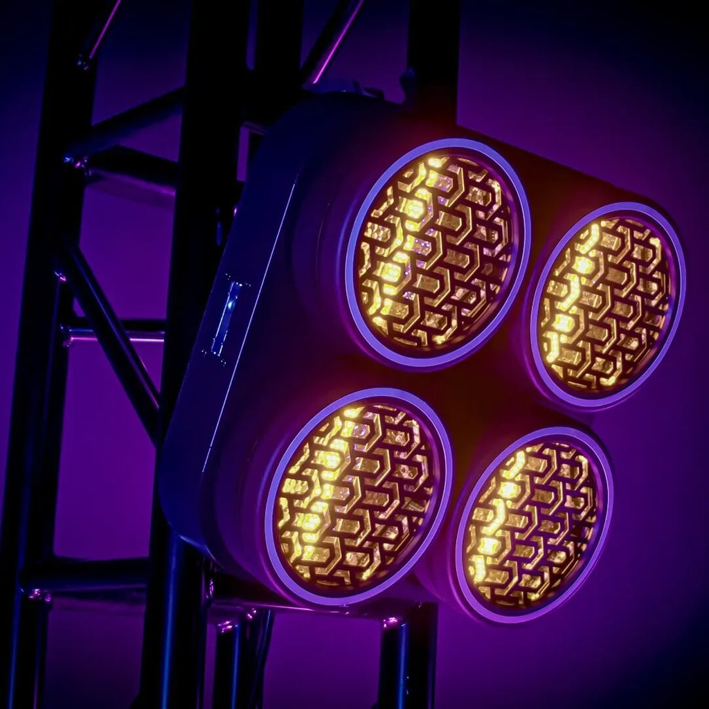 The Blizzard Lighting Lux Quadra X4 is a quad-cell blinder and RGB effect fixture that combines 1900K vintage-style warm white (amber) output with vibrant background and ring effects. Each cell features 1 x 50W WW LED with 32 x 0.2W RGB background LEDs that reflect off the aluminum inner housing, and surrounding each cell is a ring of 31 x 0.2W RGB LEDs that create dynamic color effects.