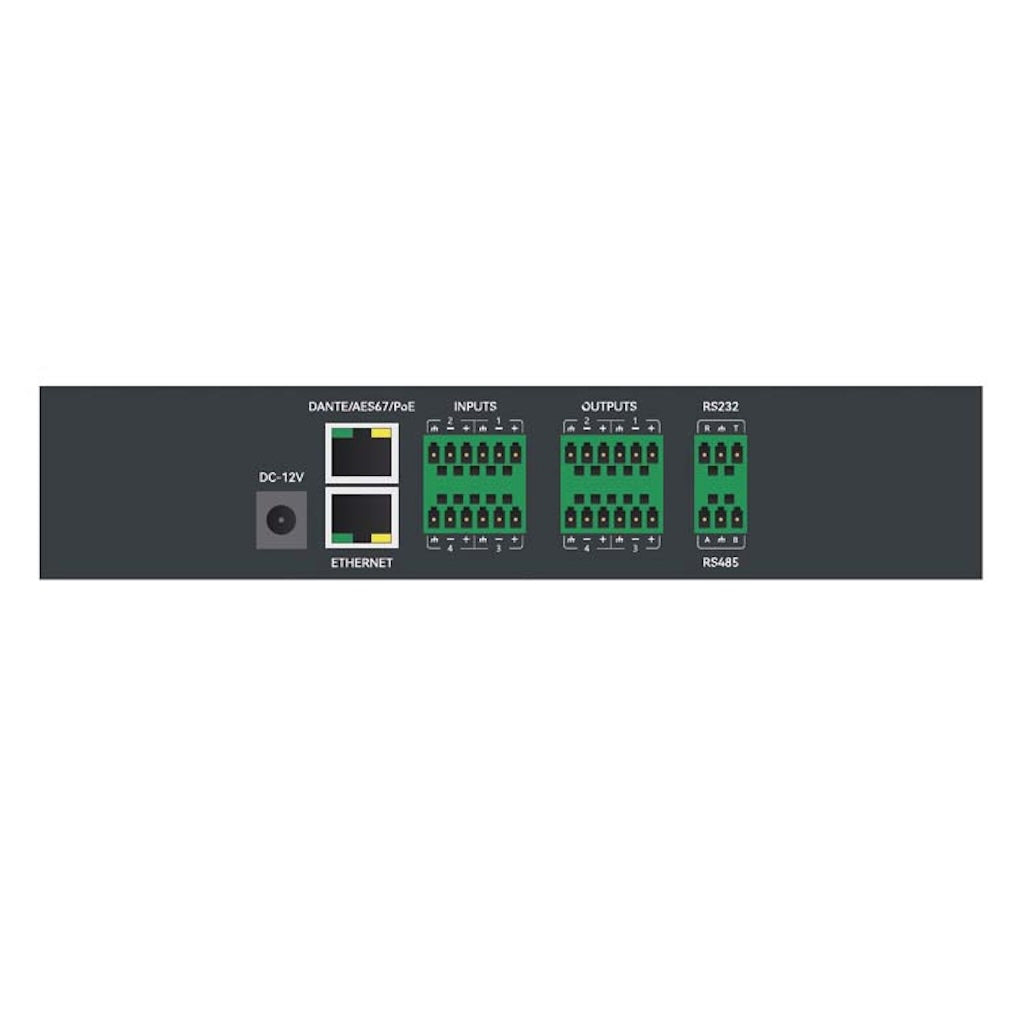 The Alfatron DSP44-UD is a 4-in/4-out Audio Digital Signal Processor with advanced audio processing capabilities. It features 4 analog inputs and outputs, 4 Dante inputs and outputs, 2 channels of Acoustic Echo Cancellation (AEC), USB audio support, and control via RS-232, RS-485, and IP.