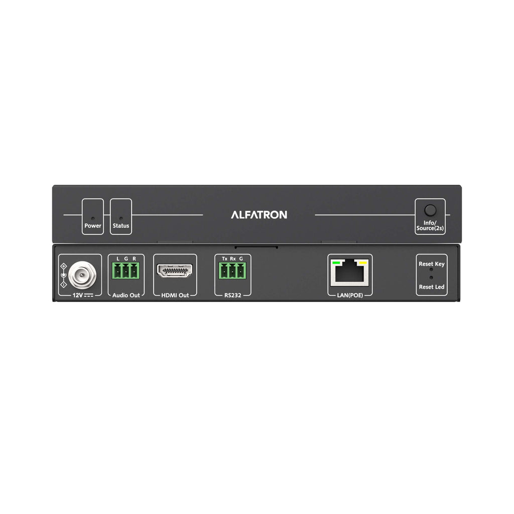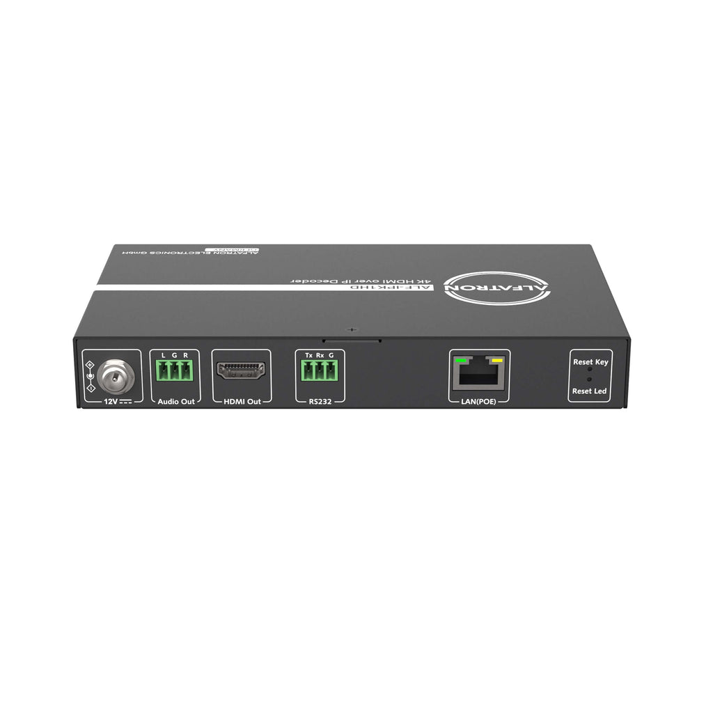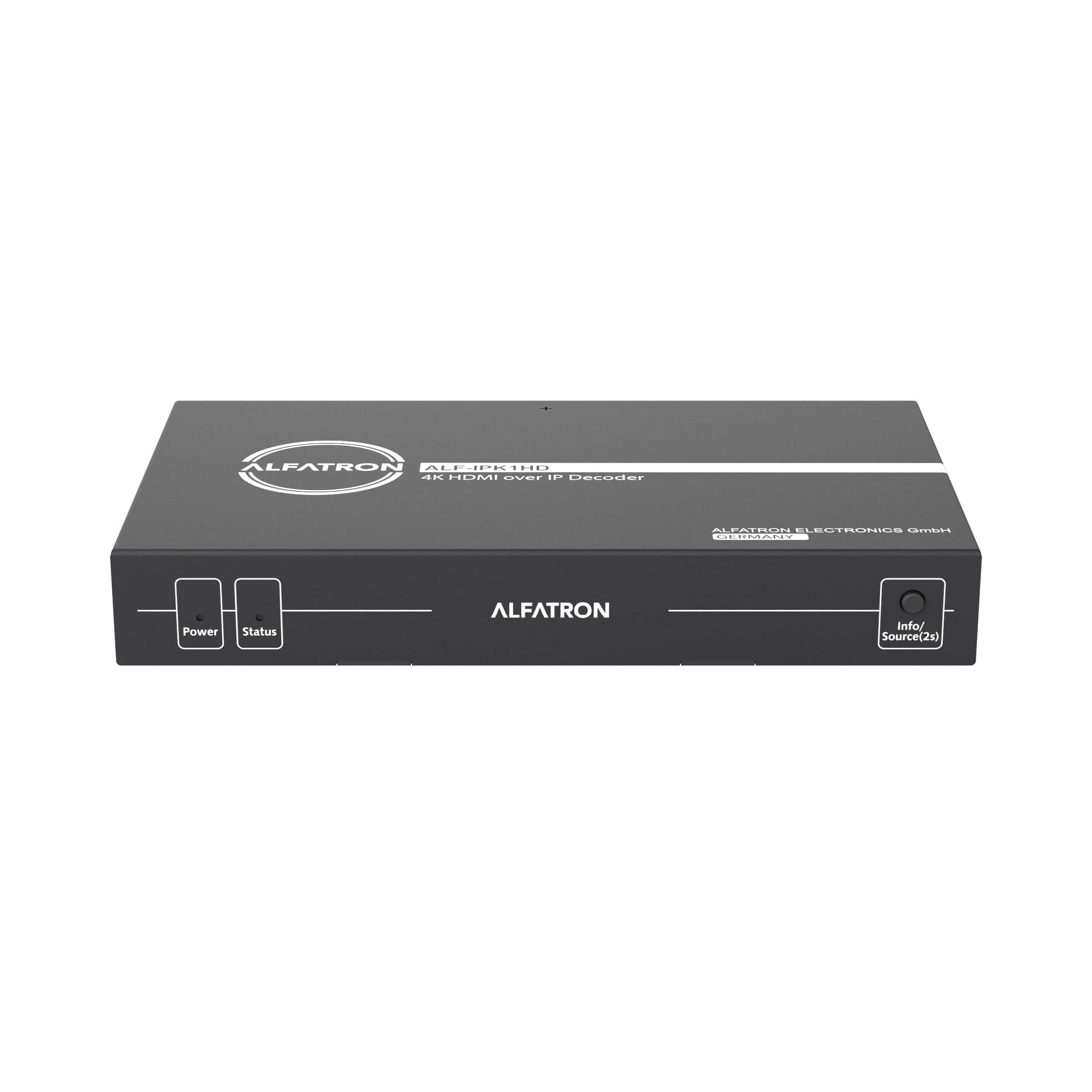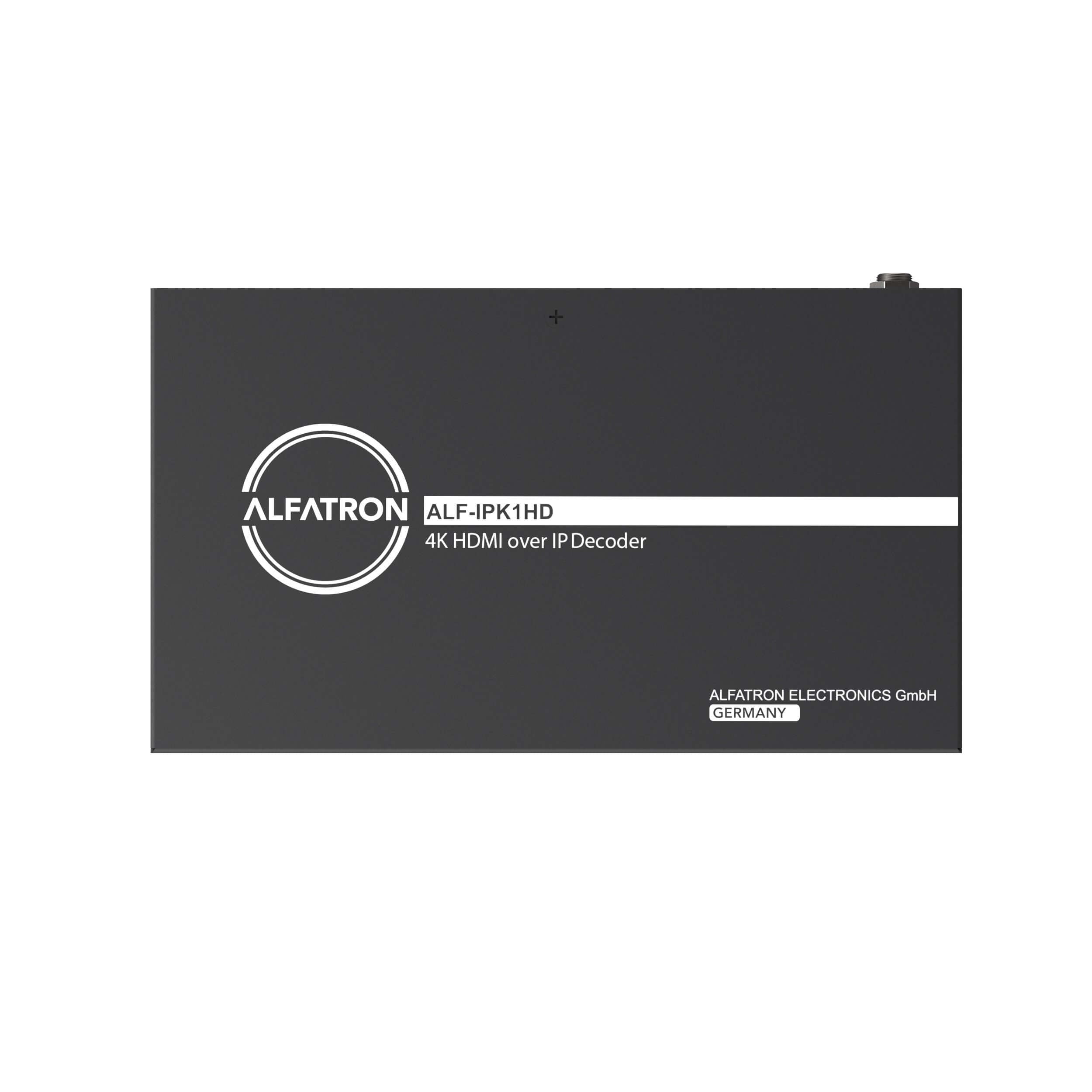 The Alfatron IPK1HD is a 4K networked AV over IP decoder utilizing the latest H.265 compression technology. It can be easily configured for IP video matrix or video wall setups using the VDirector mobile app (iOS). Designed for simple integration with Ethernet switches, it requires no IP configuration, offering a true plug-and-play experience. The decoder supports high-efficiency H.264/H.265 video codecs along with MPEG4-AAC and LPCM stereo audio. It features a built-in scaler for smooth and fast source switching, with RS-232 routing that follows the video source changes. Inputs and outputs include 1 LAN port (PoE), 1 HDMI output, 1 line-out, and 1 RS-232 port.