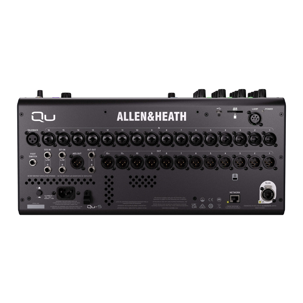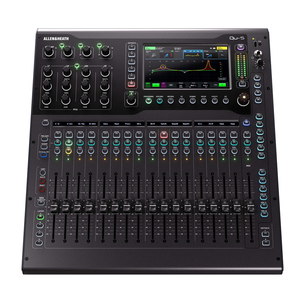 The Qu-5 is a rack mountable, 32 input channel, 96kHz digital audio mixer, combining high performance audio processing and professional features with ease of use and hands-on control. It is suitable for live music/band use, AV and install, studio and broadcast. Workflow and UI have been designed to make operation easy for inexperienced users or volunteers, provide familiarity to those transitioning from analog mixing and give quick access to more advanced features for the experienced engineer.