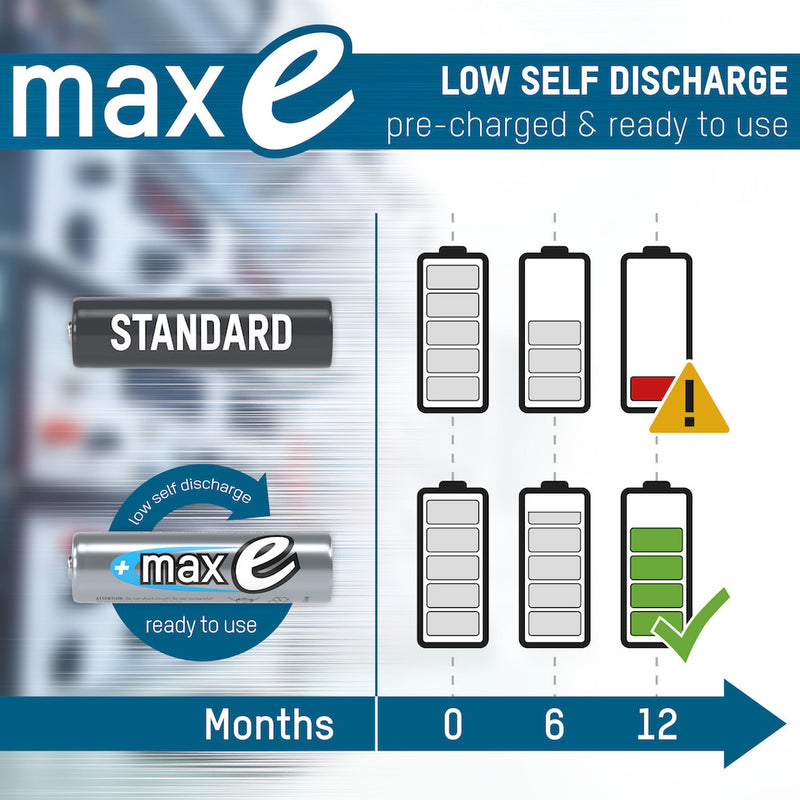 The Ansmann 9V 300 mAh Rechargeable NiMH Battery has high capacity and very low self-discharge. The self-discharge rate is 10 times lower than regular NiMH batteries. After a year, there is still around 80% of the initial capacity left. This was made possible by a special separator which dramatically reduces unwanted internal current flow.