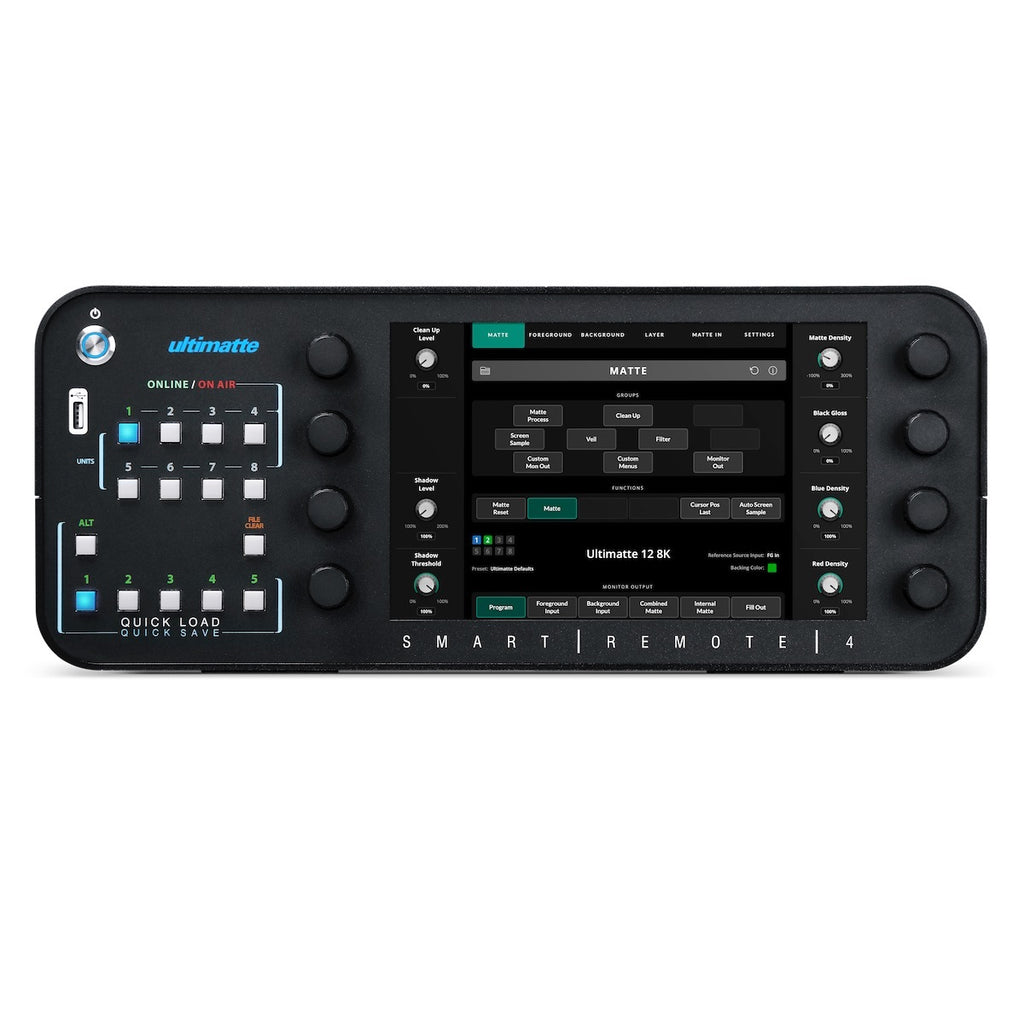 The Blackmagic Design Ultimatte Smart Remote 4 is a touchscreen remote that connects via Ethernet to control up to eight Ultimatte 12 units. Combined with the monitor cascade, this means you can view up to eight Ultimatte 12 units without adding a video router.