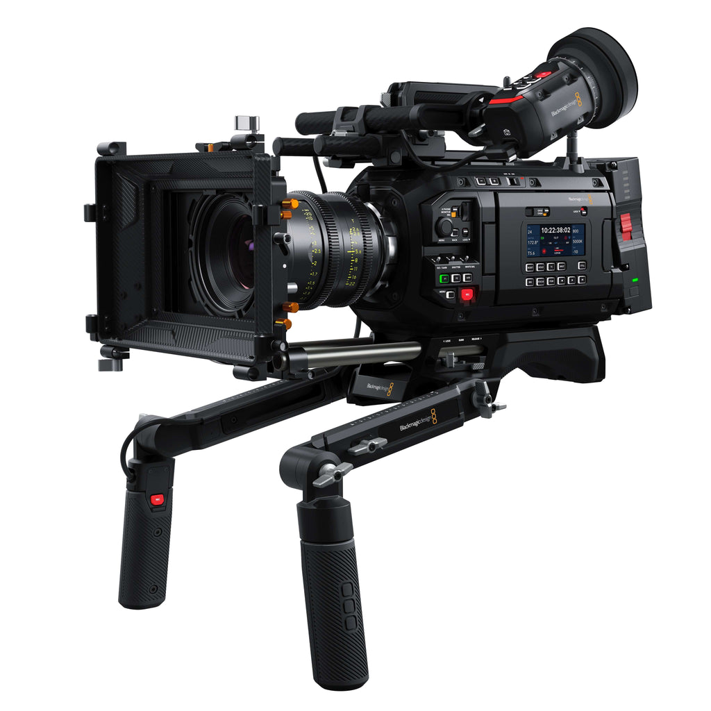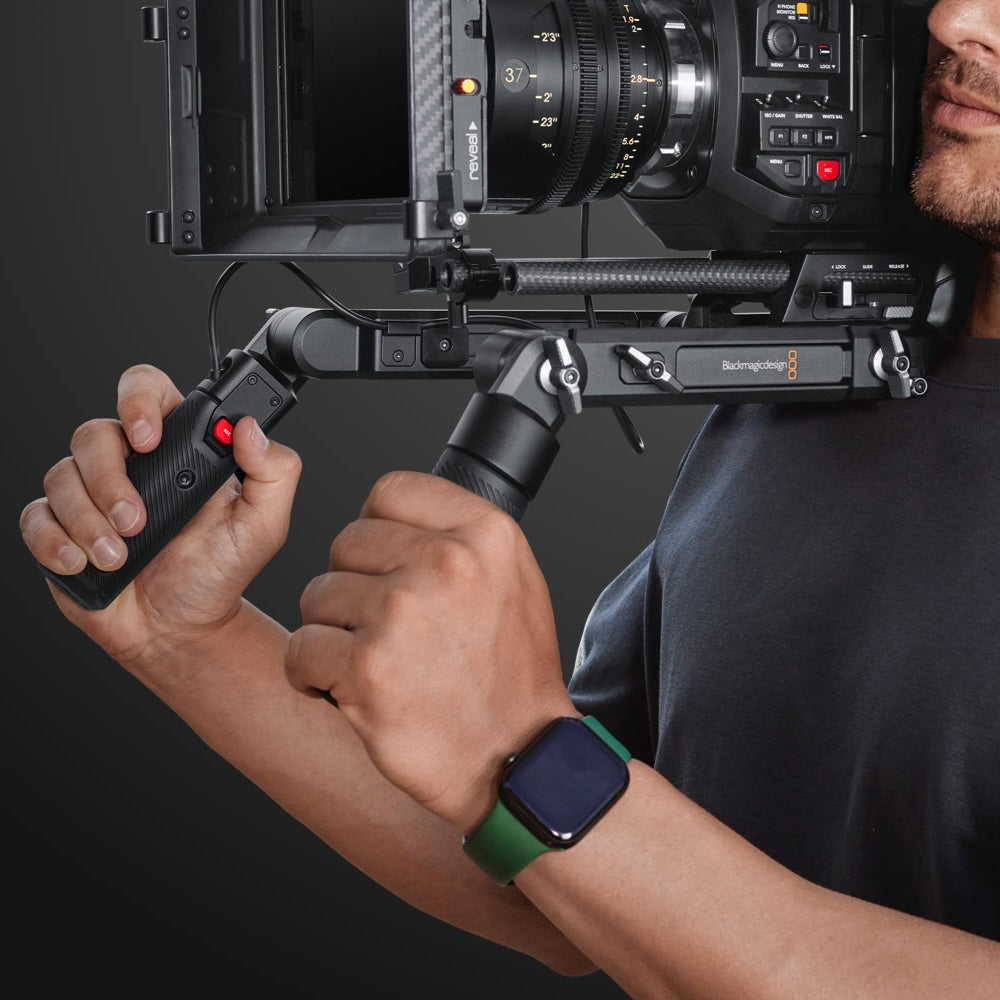 The Blackmagic Design URSA Cine Grips enable easy handheld shooting by attaching to the baseplate rosettes. It features adjustable extension arms and rotatable grips with a start/stop recording button built in.
