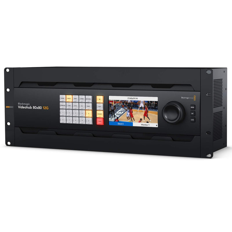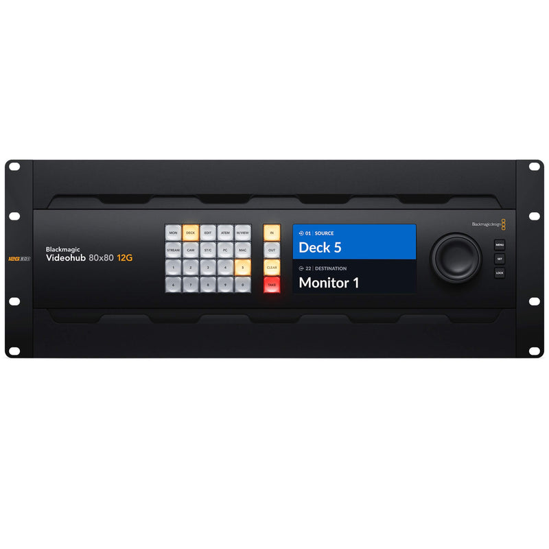 The Blackmagic Design Videohub 80x80 12G is an advanced zero latency video router that supports any combination of SD, HD and Ultra HD on the router at the same time. The 80 12G-SDI inputs feature LEDs on each BNC that indicate an SDI signal, plus there are 80 12G-SDI outputs, redundant power and reference connections in a stylish four rack unit design. The large full HD LCD lets you see video before routing and clearly displays routing labels and video standards. Routing can be performed by direct button selection and using the large spin knob control that has an electronic clutch. It also features SDI re-clocking, external Ethernet control and supports all SDI video standards up to 2160p60.