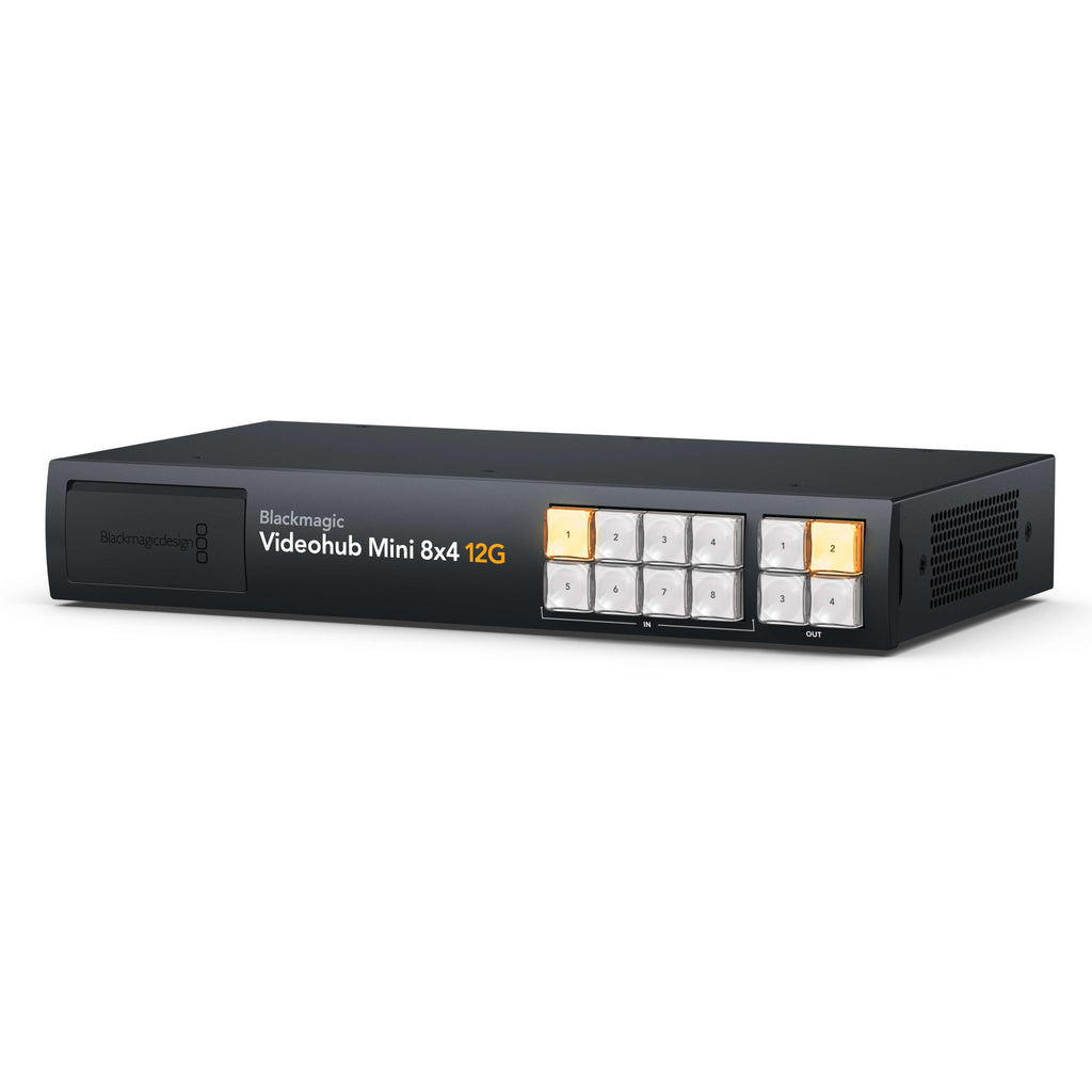 The Blackmagic Design Videohub Mini 8x4 12G is a compact zero latency video router that supports any combination of SD, HD and Ultra HD on the router at the same time. It has 8 12G-SDI inputs and 4 12G-SDI outputs plus reference connections for locking clean switch outputs in a compact 2/3 rack width size. The front panel control panel lets you quickly route a video connection and even includes an emergency 12G-SDI connection for patching in external gear and USB-C webcam video out. It also features SDI re-clocking, external Ethernet control and supports all SDI video standards up to 2160p60.