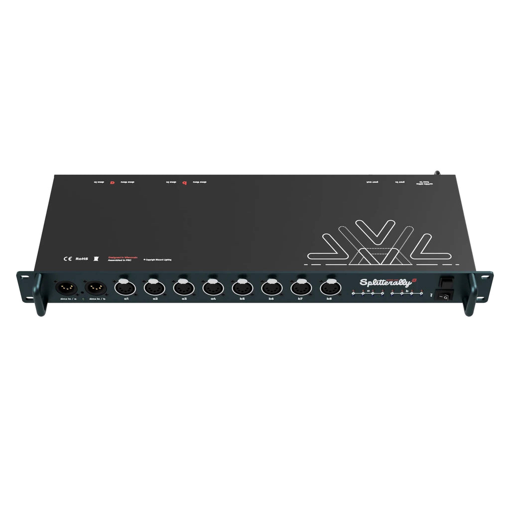 The Blizzard Lighting Pipeline Splitterally 8 is a rackmountable DMX splitter and booster. It offers dual modes with 1x8 (mode A) or 2x4 (mode B) operation, making it ideal for managing single or dual DMX universes. Dual DMX inputs with through outputs on the rear panel (A/B) provide raw pass-through connections for seamless integration into any DMX setup.