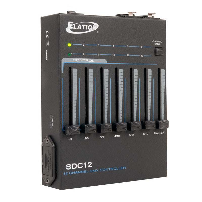 The Elation SDC12 features 12 DMX channels, DIP switches to set a starting DMX channel, a master dimmer fader, on/off switch, 3-pin and 5-pin XLR output, and operates via an external 12V DC power supply (included) or a 9VDC battery (not included).