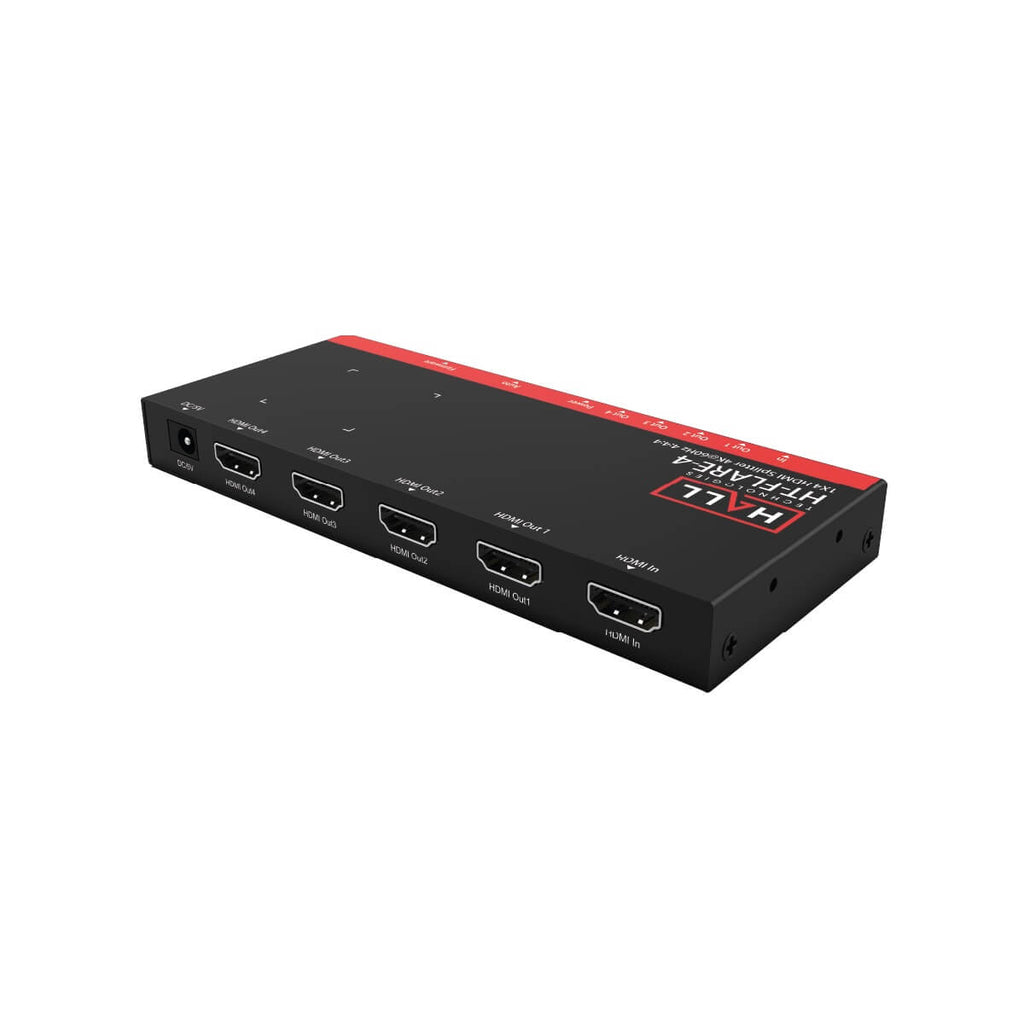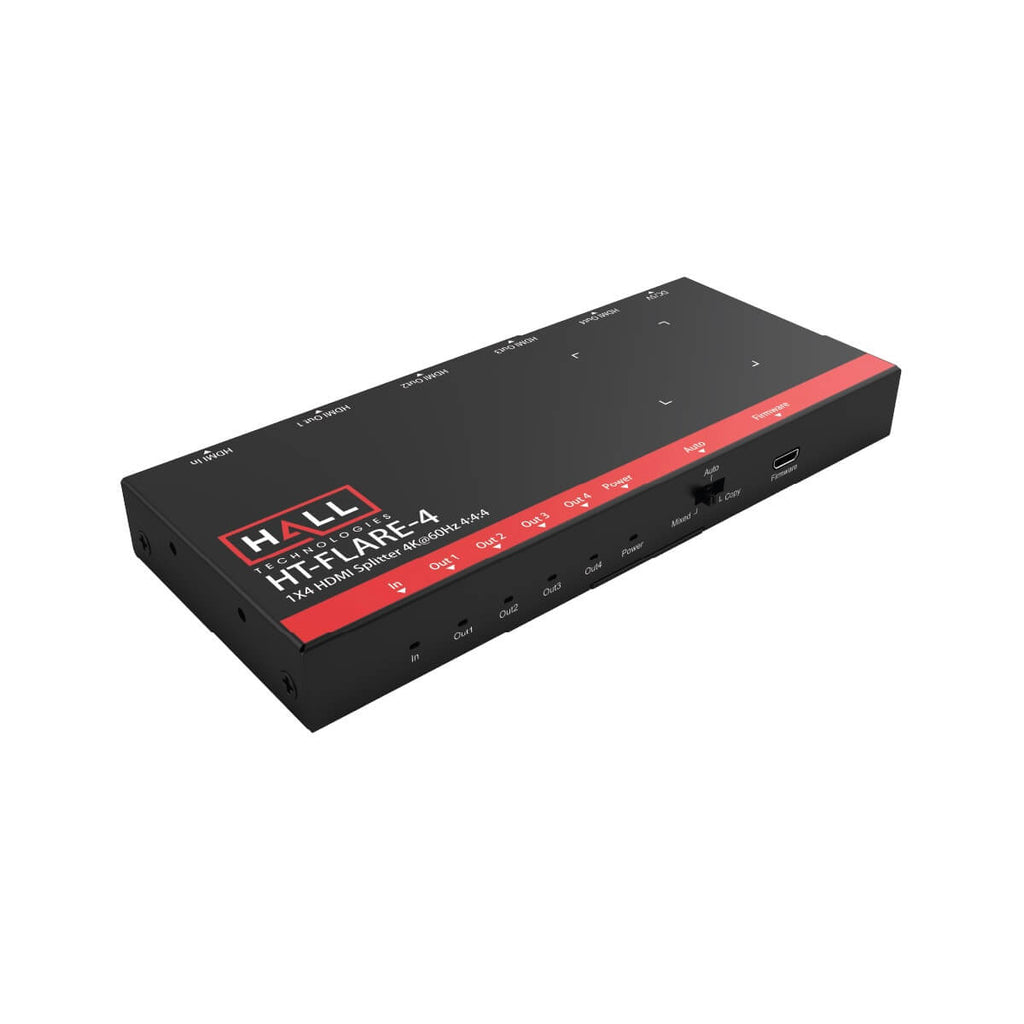 The Hall Technologies HT-FLARE-4 is a 1x4 HDMI distribution amplifier that splits a single HDMI source to four simultaneous outputs. The products support 18Gbps bandwidth, full HDMI 2.0 and HDCP 2.2 with video resolutions up to 4k@60Hz 4:4:4. The products also support simultaneous routing to 4k and 1080p displays via downscaling.