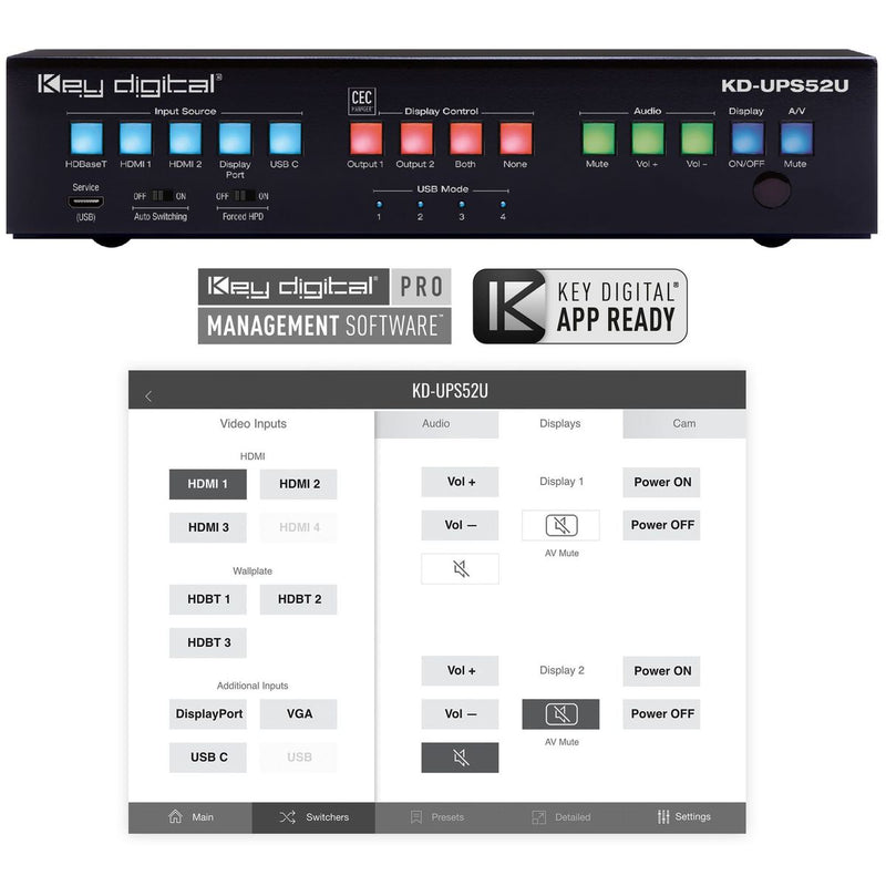 Key Digital CEC Manager enables basic controls of the connected displays for a simplistic all-in-one integration system. KD-UPS52U presentation switcher supports all SD, HD, VESA and Ultra HD/4K video standards with HDR header information included in a variety of 4K EDID handshakes. In addition to IR, RS-232, and TCP/IP control, KD-UPS52U can also be controlled via trigger voltage and features status-monitoring LEDs.