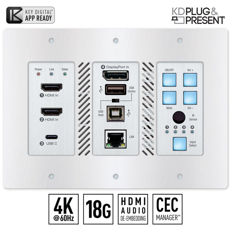 The Key Digital KD-4x1WUTx is an HDBaseT wall-plate transmitter + universal format switcher + soft-codec enabling interface with 2x HDMI, Display Port, and USB-C inputs, USB-A and USB-B connections. KD-X4x1WUTx is ideal for professional video installations in conference rooms, class rooms, lecture halls, auditoriums, and more. KD-X4x1WUTx's receivers (sold separately) feature audio de-embedding for ease of integration with audio systems. KD-X4x1WUTx features push-button or IP switching and is KD-App Ready. CEC Display control keypad enables basic controls of the connected display or projector for a simplistic all-in-one integration. In addition to AV signals, KD-X4x1WUTx extends USB 2.0, IR and RS-232 for controlling remotely located equipment. The wall-plate unit fits in a standard US three-gang box and is powered by the Rx unit or Presentation Switcher for convenient installation.