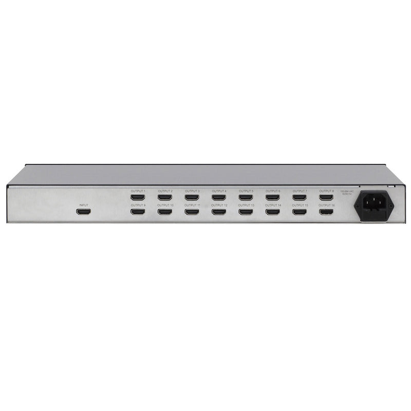 The Kramer VM-16H is a distribution amplifier for HDMI signals. It reclocks and equalizes the signal and distributes it to 16 identical outputs.