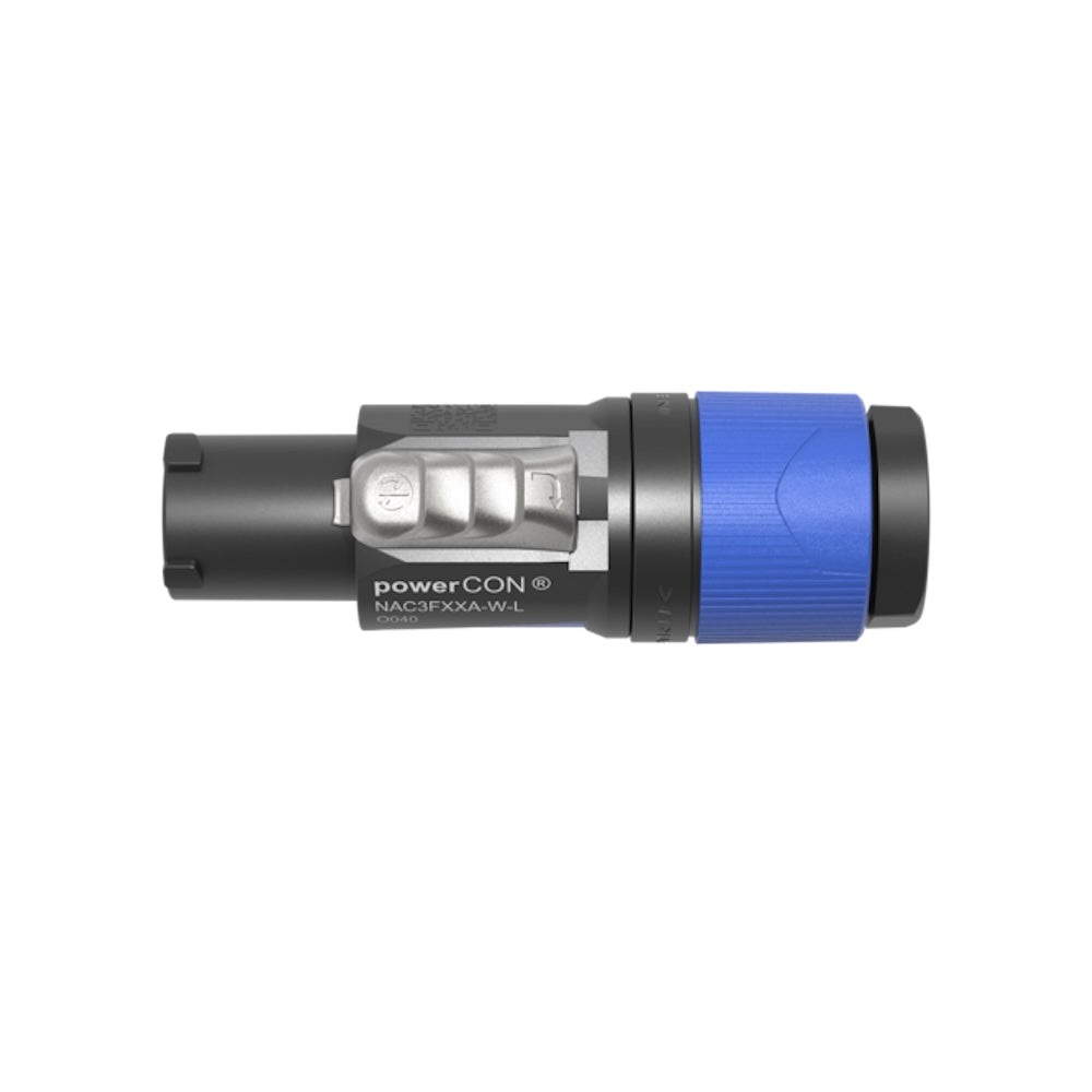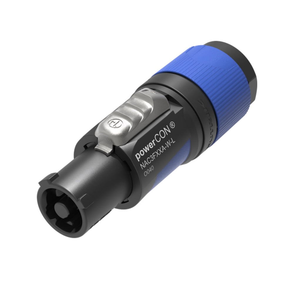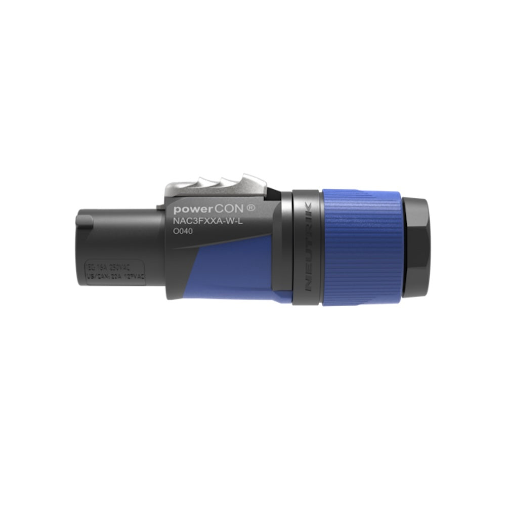 The Neutrik NAC3FXXA-W-L is a locking AC mains cable connector, keyed and color coded (blue) for power-in, screw terminal assembly, for cable diameters 10-16 mm.