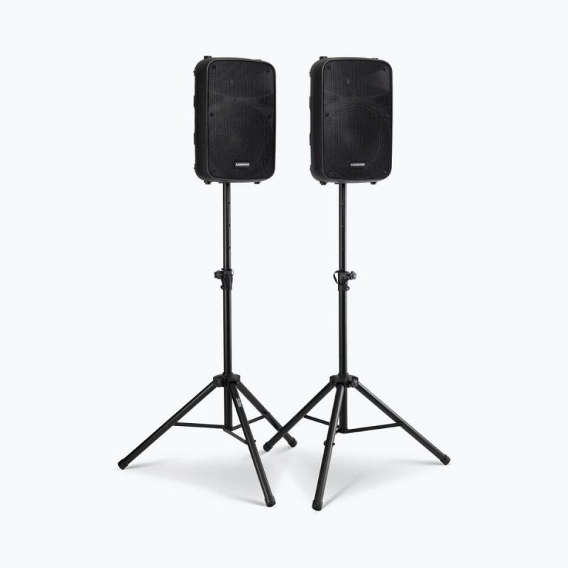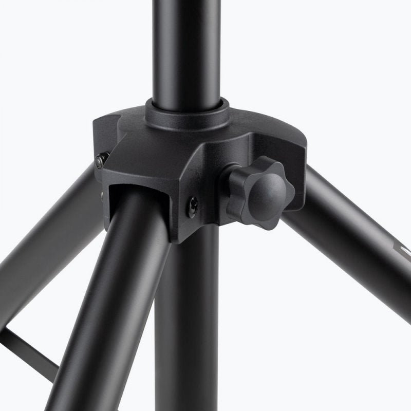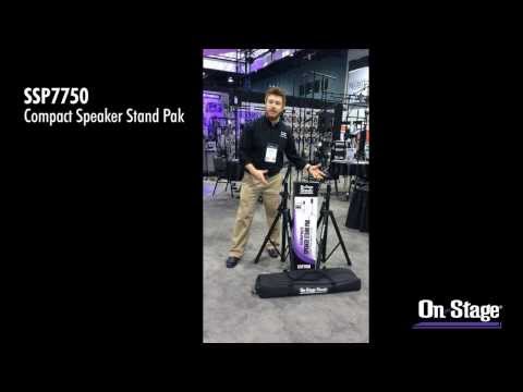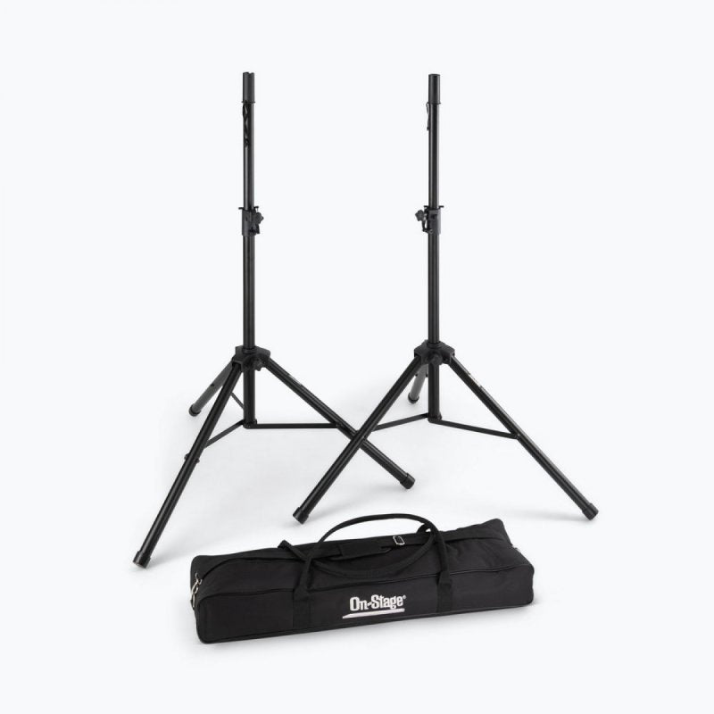 The On-Stage SSP7750 Compact Speaker Stand Pack comes with everything needed to support two speakers on individual stands. Light-weight and compact, these stands complement portable PA rigs that use smaller speakers. Featuring a versatile adaptable pole that supports all standard speaker cabinet mounting sockets, the stands also adjust in height to accommodate a variety of applications. Heavy-duty construction, braced bases, and nonslip feet work together to deliver exceptional stability and load balance even on irregular surfaces. The durable black finish preserves the professional appearance of any space. For convenient storage and ergonomic transportation, the tripod bases fold flat and all the components fit into an included carrying bag with a shoulder strap and top handles.