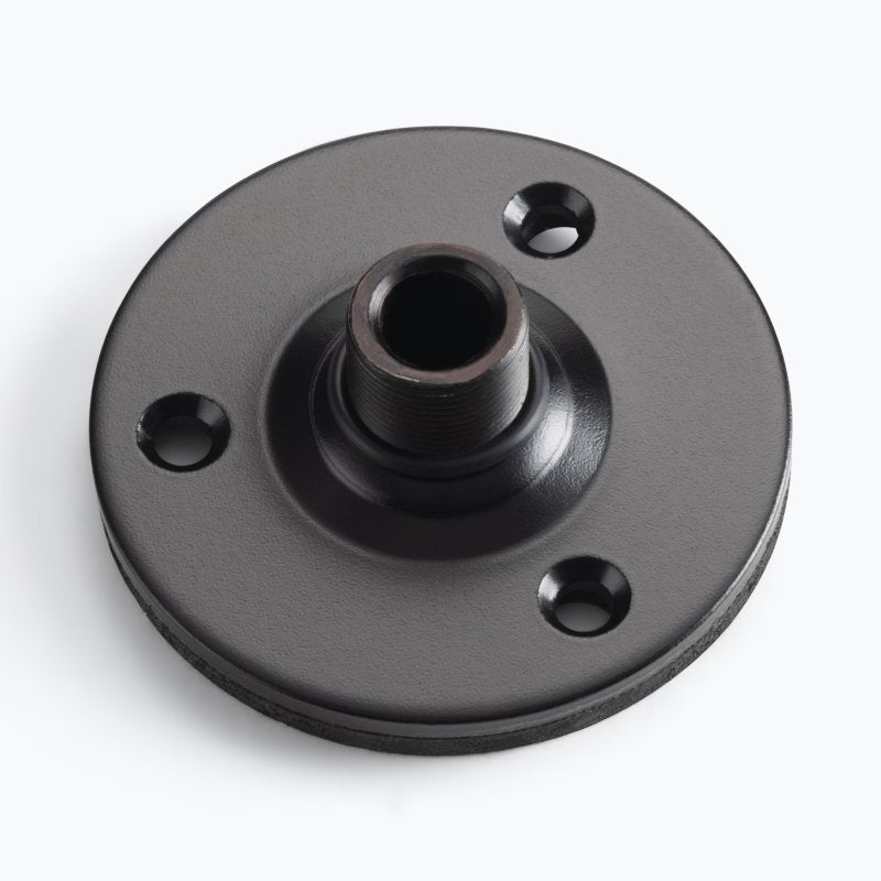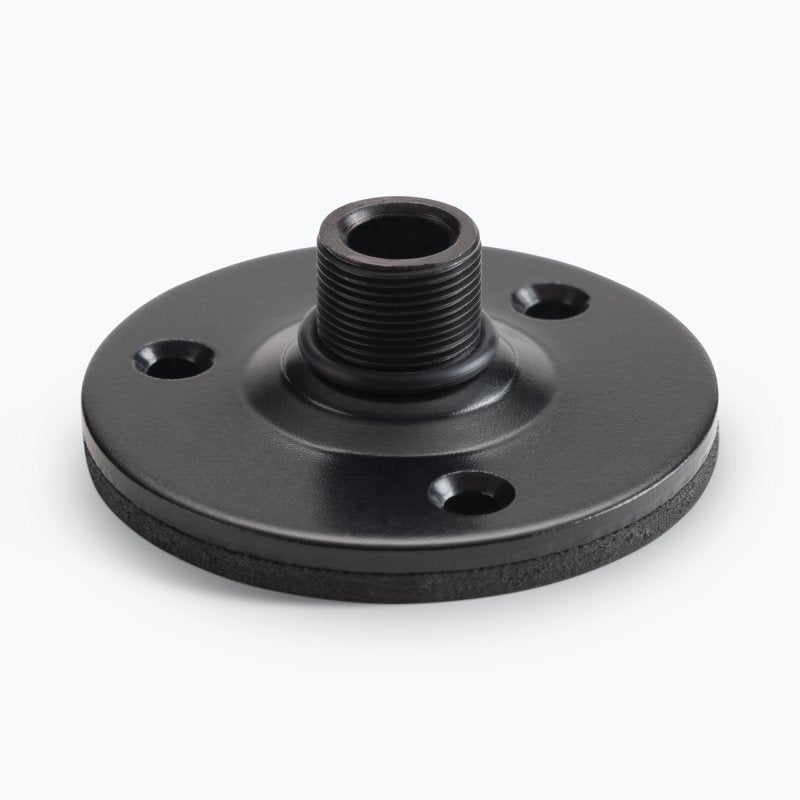 The On-Stage TM08B Flange Mount with Pad (black) enables the installation of mic clips, boom arms, and mic accessories on walls and other flat surfaces, eliminating the need for a mic stand on the floor. Its padded base reduces unwanted vibrations.