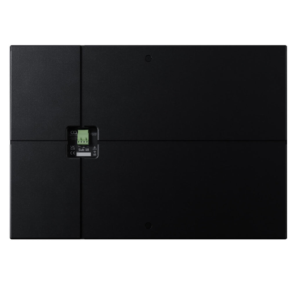 An impact-resistant perforated steel grille protects the driver, and rubber feet on the base resist movement. The Sub 18 enclosure is constructed from plywood and finished in black textured paint.