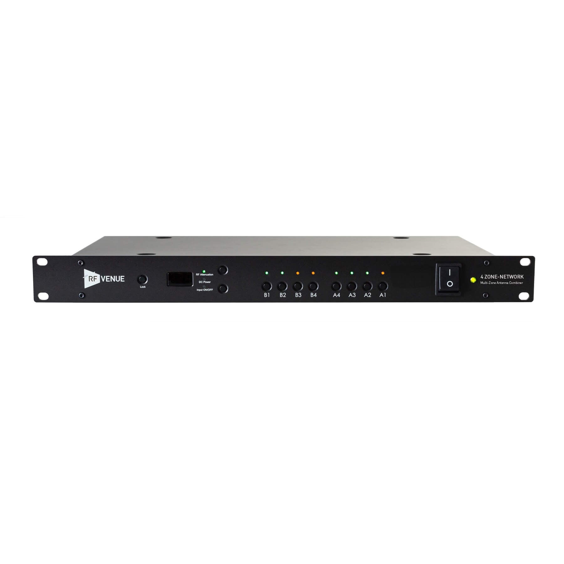 The 4ZONE Network active antenna combiner takes the complexity and expense out of multi-zone wireless microphone projects. The 4ZONE Network combines up to four separate pairs of diversity antenna connections for multi-purpose rooms, indoor-outdoor configurations, or main stages with secondary breakout rooms.