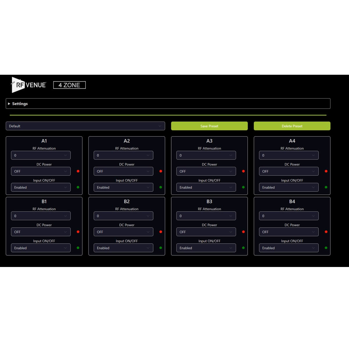 The RF Venue 4ZONE Network builds on their dependable plug-and-play multi-zone antenna combiner by adding powerful LAN-based control. Remotely check zone status, toggle zones on/off individually, and adjust settings without needing physical access to the unit. Ideal for pre-event checks and dynamic management during performances. Save and recall presets for frequently used configurations.