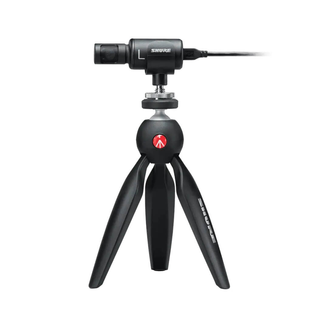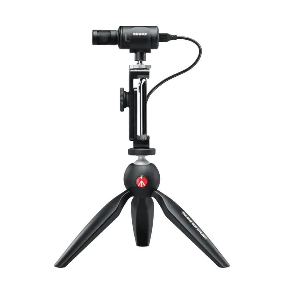 The Shure MV88+ Video Kit provides all the tools you need for high‐fidelity audio capture of live performance, field recording, interviewing, audio for video and vocal and instrument recording. It includes a Manfrotto® PIXI tripod, phone clamp, and mount, as well as iOS and USB-C cables for next-level compatibility and connectivity. Just add your phone and you’ll be capturing professional quality content wherever you are. (packaging may vary)