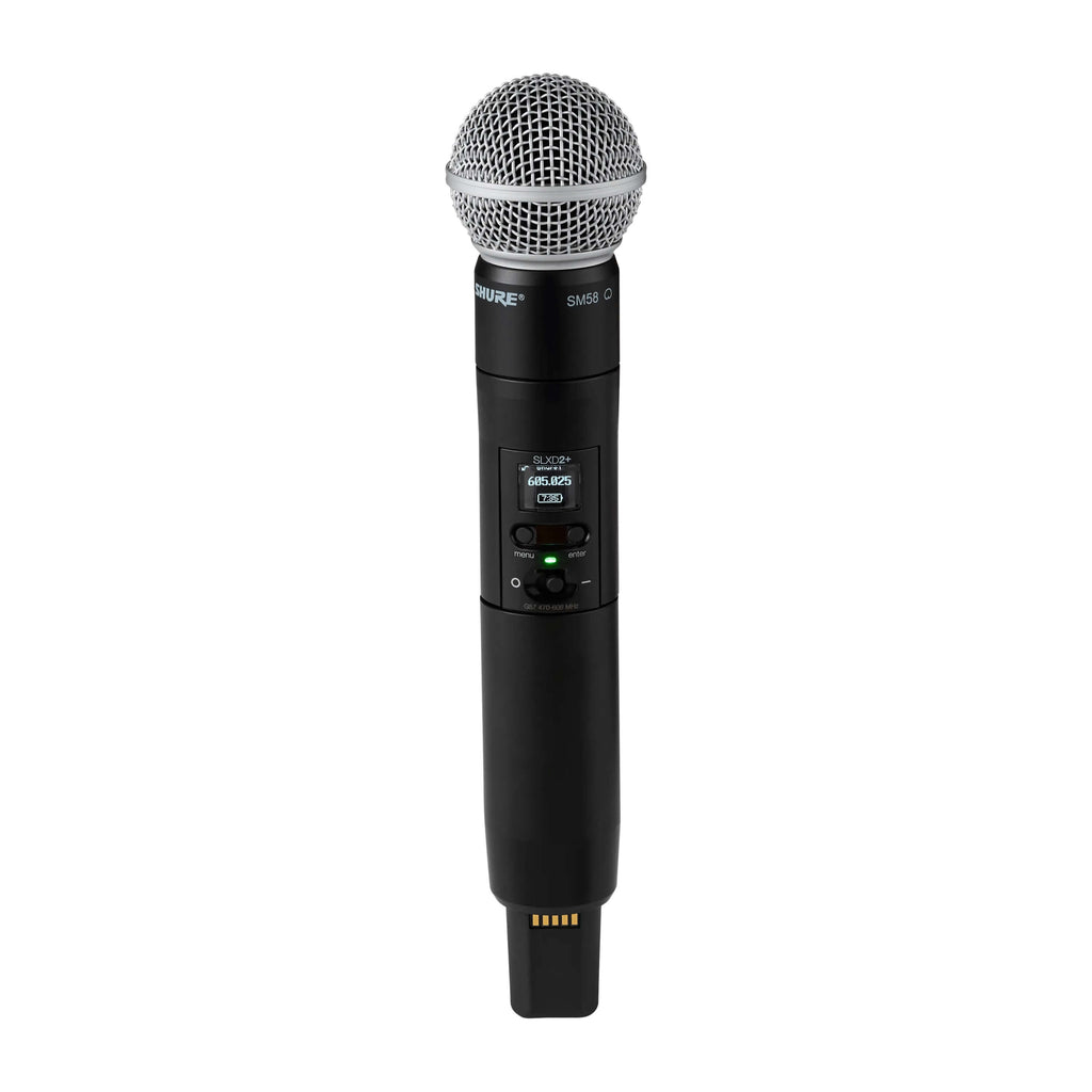 The Shure SLXD2+/58 wireless handheld transmitter, featuring the legendary SM58 cardioid dynamic microphone, delivers 24-bit digital audio and rock solid RF performance. Wide-tuning SLXD+ transmitters and receivers stay in sync courtesy of a dedicated ShowLink® Ease control link that enables remote management and powerful automated features. Monitor RF status and control receiver and transmitter parameters with Wireless Workbench desktop software, or remotely with the WWB Mobile app over Wi-Fi or Bluetooth. Additionally, each SLX-D+ component and system ships with Digital Feedback Reducer DSP and AES-256 Encryption installed, for complete and secure peace of mind.