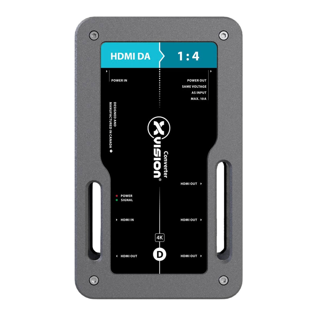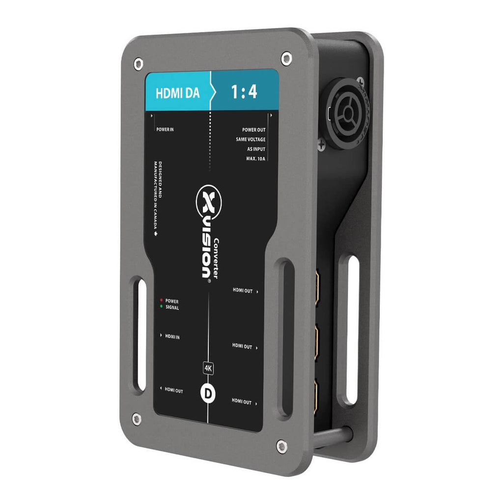 The Theatrixx XVVHDMIDA4T1 xVision Converter HDMI Distribution Amp 1:4 with True1 connector automatically downscales per output so you can effortlessly send the same signal to 4K and FullHD displays with a single signal source. It also features locking HDMI ports to prevent accidental disconnection. HDMI input tested and compatible with Apple devices.